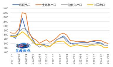 目前我國厚壁鋼管出口報價優勢仍存。研究中心監測數據顯示,截至2024年4月11日,印度、土耳其、獨聯體熱軋卷板出口報價(FOB)分別為560美元/噸、605美元/噸和565美元/噸,中國熱軋卷板出口報價(FOB)為515美元/噸;目前我國熱卷出口報價分別較印度、土耳其、獨聯體熱卷出口報價低45美元/噸、90美元/噸和50美元/噸(詳見圖4)。