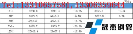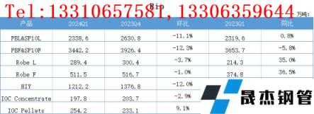 PBL&SP10L第一季度產(chǎn)量2338.6萬(wàn)噸,環(huán)比下降11.1%,同比上升0.8%;PBF&SP10F第一季度產(chǎn)量3442.2萬(wàn)噸,環(huán)比下降12.3%,同比下降5.8%;Robe L第一季度產(chǎn)量289.4萬(wàn)噸,環(huán)比下降3.7%,同比上升35.0%;Robe F第一季度產(chǎn)量511.5萬(wàn)噸,環(huán)比下降1.0%,同比上升36.5%;HIY第一季度產(chǎn)量1212.2萬(wàn)噸,環(huán)比下降12.0%,同比下降11.3%;IOC Concentrate第一季度產(chǎn)量197.8萬(wàn)噸,環(huán)比下降2.9%,同比下降6.4%;IOC Pellets第一季度產(chǎn)量254.2萬(wàn)噸,環(huán)比上升9.1%,同比上升16.1%。