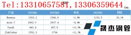 2024年第一季度,Rio鐵礦石總產(chǎn)量8238.8萬(wàn)噸,環(huán)比下降10.6%,同比下降1.4。