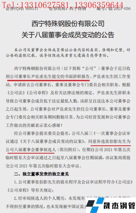 2021年12月10日,西寧特鋼發(fā)布公告,公司人事變動:董事長尹良求、總工苗紅生辭職!張伯影擬任董事!