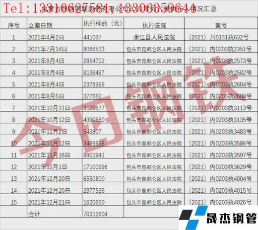 免責聲明:本網站(山東聊城晟杰無縫鋼管廠www.yztongfa.com)刊載的“超7000萬!包鋼股份年內15次被法院執行!”等均源于網絡,版權歸原作者所有,且僅代表原作者觀點,本文所載信息僅供參考。轉載僅為學習與交流之目的,如無意中侵犯您的合法權益,請及時聯系刪除。本網站刊登此篇文章并不意味著本站贊同其觀點或證實其內容的真實性,我們不對其科學性、嚴肅性等作任何形式的保證。如果侵犯了您的版權,請盡快聯系我們予以撤銷,謝謝合作!