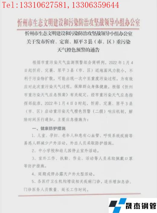 根據(jù)忻州市重污染天氣監(jiān)測預警組會商研判,2022年1月4日0時起 ,忻府、定襄、原平3縣(市、區(qū))啟動重污染天氣橙色預警(二級)響應機制,解除時間另行通知。相關(guān)強制性污染減排措施為: