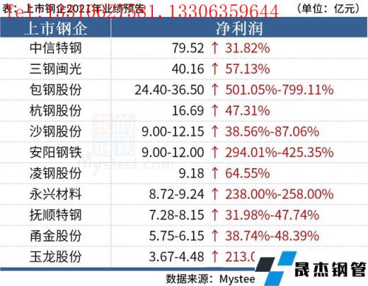 免責聲明:本網站(山東聊城晟杰無縫鋼管廠www.yztongfa.com)刊載的“2021年鋼企利潤創新高,中信特鋼實現凈利近80億”等均源于網絡,版權歸原作者所有,且僅代表原作者觀點,本文所載信息僅供參考。轉載僅為學習與交流之目的,如無意中侵犯您的合法權益,請及時聯系刪除。本網站刊登此篇文章并不意味著本站贊同其觀點或證實其內容的真實性,我們不對其科學性、嚴肅性等作任何形式的保證。如果侵犯了您的版權,請盡快聯系我們予以撤銷,謝謝合作!