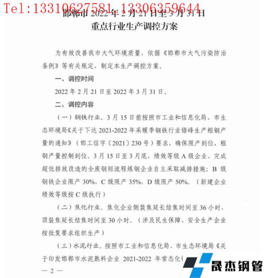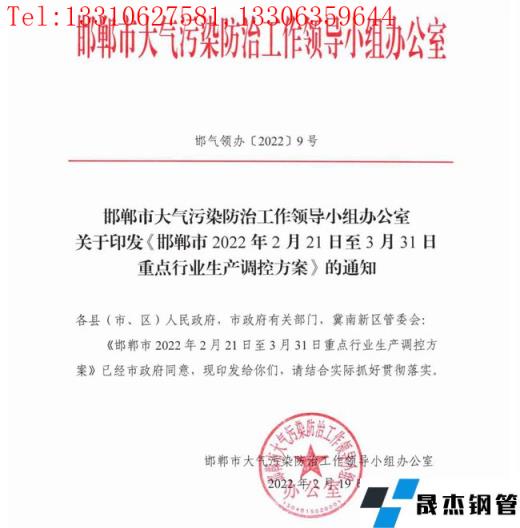 日前,邯鄲市大氣污染防治工作領(lǐng)導(dǎo)小組辦公室印發(fā)了《邯鄲市2022年2月21日至3月31日重點(diǎn)行業(yè)生產(chǎn)調(diào)控方案》。方案中對2022年2月21日至3月31日時(shí)段內(nèi)的鋼鐵、焦化、水泥、獨(dú)立球團(tuán)、鑄造、炭素等重點(diǎn)行業(yè)開展停限產(chǎn)措施。