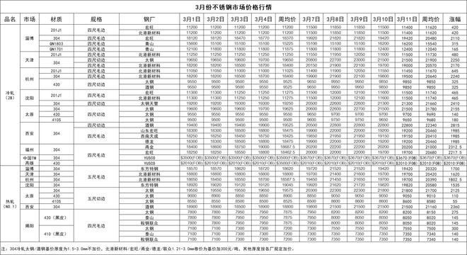 受到鎳價格上漲影響,國內近期不銹鋼市場動蕩較明顯,3月第2周不銹鋼市場價格較3月第1周有明顯的的上漲情況,上漲幅度最高每噸可達21900元/噸的價格。其中冷軋201不銹鋼在3月4日價格達到11200元/噸,并于3月7日價格迅速調整到11500元/噸,價格上漲300元/噸。同系列冷軋201不銹鋼于3月10日價格回調至11500,降幅達到350元/噸。