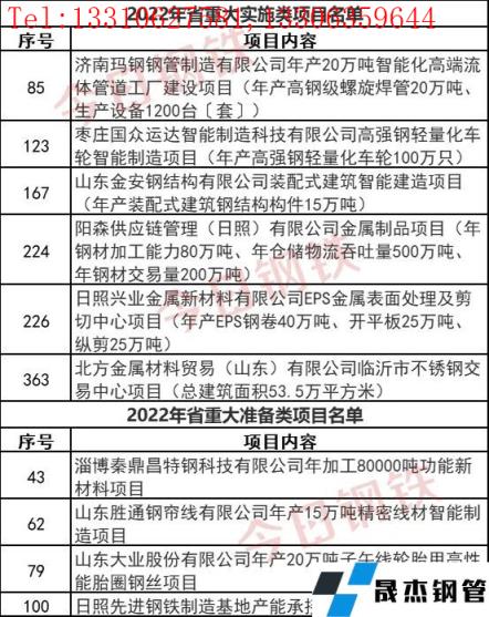 2022年1月20日,山東省人民政府發(fā)布《關(guān)于下達2022年省重大項目名單的通知》。此次通知中公布的600個項目中,涉及重大實施類項目449項,重大準(zhǔn)備類項目151項。其中涉及到日照先進鋼鐵制造基地產(chǎn)能承接一期項目、濟南瑪鋼厚壁無縫鋼管制造有限公司年產(chǎn)20萬噸智能化高端流體管道工廠建設(shè)項目等10個鋼鐵相關(guān)項目。