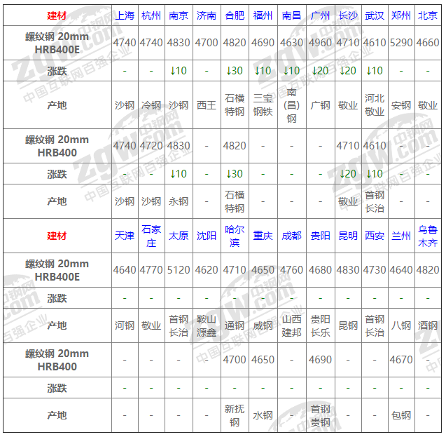 全國24個主要市場螺紋鋼 20mm HRB400E平均價格4765元/噸,較上個交易日下調5元/噸。