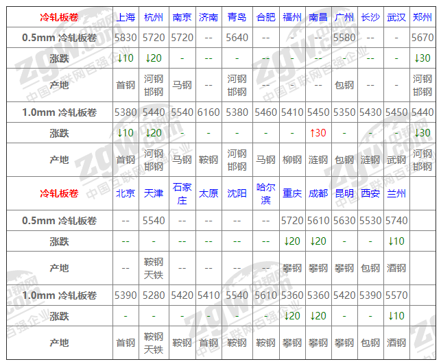 全國23個主要市場1.0mm 冷軋板卷平均價格5463元/噸,較上個交易日下調5元/噸。
