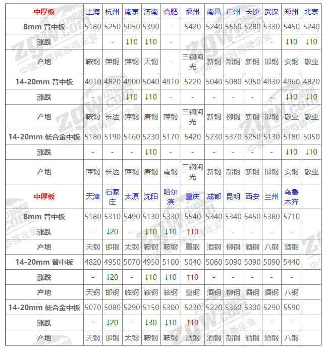 全國23個主要市場14-20mm 普中板平均價格5017元/噸,較上個交易日下調3元/噸。