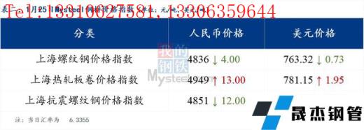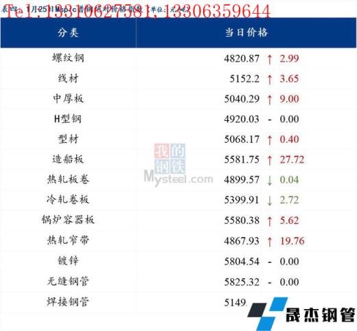 1月25日Myspic普鋼絕對(duì)價(jià)格指數(shù)變化:綜合指數(shù)5041.97,上漲3.92;螺紋鋼指數(shù)4820.87,上漲2.99;線(xiàn)材指數(shù)5152.2,上漲3.65;熱軋板卷指數(shù)4899.57,下跌0.04;冷軋板卷指數(shù)5399.91,下跌2.72;中厚板指數(shù)5040.29,上漲9.0。