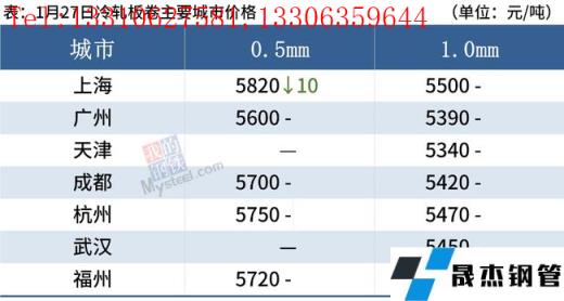 冷軋板卷:1月27日,全國24個主要城市1.0mm冷卷均價5468元/噸,較上個交易日持平。據不完全統計,現冷軋無縫鋼管廠家庫存36.05萬噸,周環比增加1.64萬噸,社會庫存125.26萬噸,周環比增加2.88萬噸,周消費量77.89萬噸,環比減少1.95萬噸。綜合來看,故預計28日國內冷軋板卷價格或將繼續平穩運行。