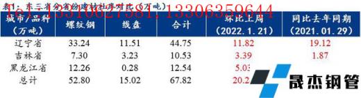 本周東三省建筑鋼材現(xiàn)貨庫存增加較多,增幅明顯超上周,其中螺紋鋼現(xiàn)貨庫存52.8萬噸,線盤15.02萬噸,建材社會庫存總量為67.82萬噸,較上周增20.24萬噸,增幅高達42.54%。隨著春節(jié)的臨近,北方下游終端工程進入全停工狀態(tài),需求已無,出貨趨零,加之各個無縫鋼管廠家廠庫前移至市場各倉庫的現(xiàn)貨相對較多,社庫開始大幅度累庫。