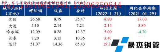 各主流城市分倉庫來看,本周沈陽市場幾大主流倉庫增庫較多;本周大連遠東鋼材市場新鵬輝到貨較多,其余倉庫新?lián)徜撘苍陉懤m(xù)到貨。吉林省內(nèi)長春兩大主流倉庫現(xiàn)貨庫存也在增加。從無縫鋼管廠家產(chǎn)量及庫存來看,本周區(qū)域內(nèi)樣本無縫鋼管廠家總產(chǎn)量43.1萬噸,較上周增.9萬噸;廠庫總量12.56萬噸,較上周減少1.01萬噸,社庫則大幅度增20.24萬噸;本周無縫鋼管廠家產(chǎn)量增、廠庫降、社庫繼續(xù)大增,主要原因是部分無縫鋼管廠家復(fù)產(chǎn)、產(chǎn)量略有回升,廠庫繼續(xù)前移至市場,而貿(mào)易商由于下游無需求幾乎也無成交,預(yù)計春節(jié)過后區(qū)域內(nèi)社會庫存將繼續(xù)增加。
