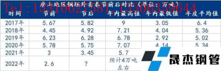 受環保限產政策壓制,2021年下游調坯廠家生產嚴重受限,日均需求量5.71萬噸,年同比降18.89%,對于鋼坯需求形成較大掣肘。進入2022年1月,調坯廠家恢復生產,鋼坯需求隨之增加,但臨近春節,加之坯材價差縮小,唐山地區獨立軋鋼企業陸續停產放假,開工率及產能利用率下降明顯,據統計:截至1月27日通過對唐山地區53家調坯軋無縫厚壁鋼管廠家進行統計,本周唐山地區調坯軋無縫厚壁鋼管廠家平均日消耗鋼坯量約3.51萬噸,周比降2.45萬噸。2月份冬奧會期間,唐山地區獨立軋鋼企業預計生產將繼續受限,開工率及產能利用率或將保持低位運行,且目前軋鋼企業廠內成品庫存和鋼坯庫存水平高于去年同期,因此鋼坯需求或處在低迷態勢。后期隨冬奧會結束,受終端季節性需求利好影響,鋼坯需求或將集中釋放。