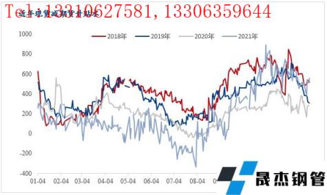 由圖所示,為2018年至2021年,省內(nèi)南京市場(chǎng)現(xiàn)貨價(jià)格與期貨螺紋鋼價(jià)格之差。各年均值分別為417.38元/噸、361.51元/噸、213.99元/噸、195.69元/噸。可以發(fā)現(xiàn)去年有兩個(gè)很鮮明的特點(diǎn):1、期貨市場(chǎng)預(yù)期最好,雖然絕對(duì)價(jià)格處于歷年最高區(qū)間,但是期貨貼水反而是近年最低的;2、7、8月份期貨預(yù)期很飽滿(mǎn),達(dá)到歷史最低現(xiàn)期差,以南京市場(chǎng)為例,現(xiàn)貨價(jià)格一度低于期貨337元/噸,這是非常罕見(jiàn)的,也給市場(chǎng)很好的期現(xiàn)套利的機(jī)會(huì)。由圖所示,現(xiàn)期差從-337拉至890,單邊幅度高達(dá)1227元/噸。