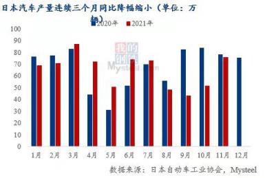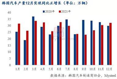 2021年11月日本汽車產量76萬輛,環(huán)比增長47%,截至2021年11月,日本汽車產量同比降幅連續(xù)三個月收窄;韓國2021年12月汽車產量32萬輛,環(huán)比增長5%,同比增長7%,是近四個月首次實現同比增長。