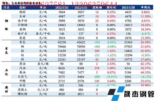免責聲明:本網站(山東聊城晟杰無縫鋼管廠www.yztongfa.com)刊載的“大宗原材料價格周報(1.24-1.28)”等均源于網絡,版權歸原作者所有,且僅代表原作者觀點,本文所載信息僅供參考。轉載僅為學習與交流之目的,如無意中侵犯您的合法權益,請及時聯系刪除。本網站刊登此篇文章并不意味著本站贊同其觀點或證實其內容的真實性,我們不對其科學性、嚴肅性等作任何形式的保證。如果侵犯了您的版權,請盡快聯系我們予以撤銷,謝謝合作!