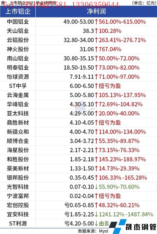 免責聲明:本網站(山東聊城晟杰無縫鋼管廠www.yztongfa.com)刊載的“23家上市鋁企披露2021年業績預報,超8成凈利潤增長”等均源于網絡,版權歸原作者所有,且僅代表原作者觀點,本文所載信息僅供參考。轉載僅為學習與交流之目的,如無意中侵犯您的合法權益,請及時聯系刪除。本網站刊登此篇文章并不意味著本站贊同其觀點或證實其內容的真實性,我們不對其科學性、嚴肅性等作任何形式的保證。如果侵犯了您的版權,請盡快聯系我們予以撤銷,謝謝合作!