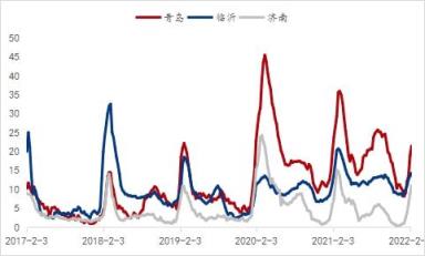 本周山東地區(qū)市場(chǎng)價(jià)格呈現(xiàn)盤整趨強(qiáng)的走勢(shì),但市場(chǎng)成交弱勢(shì),整體資源情況出現(xiàn)明顯變化。具體來(lái)看,本周山東各市場(chǎng)庫(kù)存情況如下: