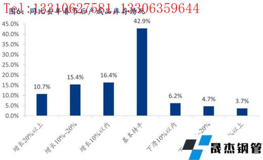 據調研,42.9%的樣本企業產成品庫存情況與去年春節后基本持平,42.5%的樣本企業產成品庫存較去年有增加,14.6%的樣本企業產成品庫存同比下降。