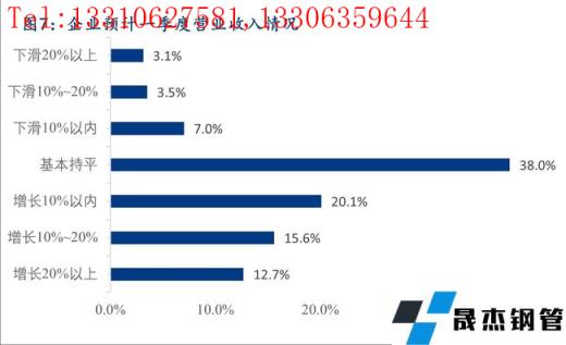 3、對于一季度營業收入的情況,38.0%的企業預計一季度營業收入與去年同期基本持平,48.3%的企業預計一季度營業收入與去年同期相比有所增長,13.6%的企業一季度營業收入同比下降,其中預計一季度營業收入增幅20%以上及降幅20%以上的企業分別占比12.7%和3.1%。