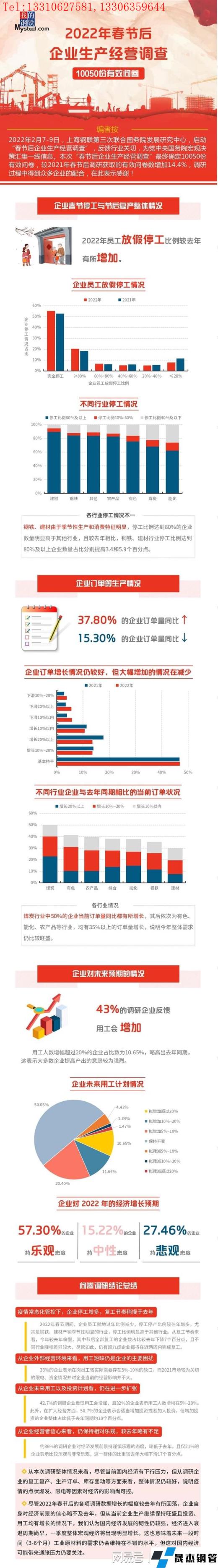 2022年2月7-9日,上海鋼聯第三次聯合國務院發展研究中心,啟動“春節后企業生產經營調查”,反饋行業關切,為黨中央國務院宏觀決策匯集一線信息。本次“春節后企業生產經營調查”最終確定10050份有效問卷,較2021年春節后調研獲取的有效問卷數增加14.4%。 具體結論如下: