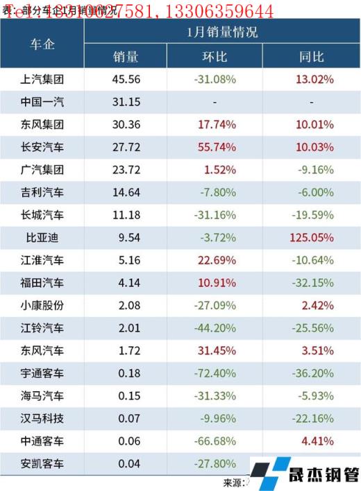 免責聲明:本網站(山東聊城晟杰無縫鋼管廠www.yztongfa.com)刊載的“1月我國汽車產銷降幅明顯,多數車企呈現雙位數下跌”等均源于網絡,版權歸原作者所有,且僅代表原作者觀點,本文所載信息僅供參考。轉載僅為學習與交流之目的,如無意中侵犯您的合法權益,請及時聯系刪除。本網站刊登此篇文章并不意味著本站贊同其觀點或證實其內容的真實性,我們不對其科學性、嚴肅性等作任何形式的保證。如果侵犯了您的版權,請盡快聯系我們予以撤銷,謝謝合作!