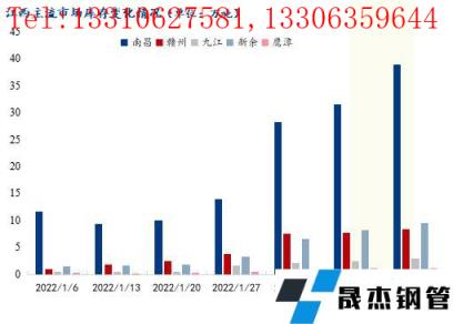 從本周各主流市場庫存走勢來看,各主流市場庫存均繼續累積。其中南昌市場庫存增幅最大,增幅達到23.20%;九江和新余市場庫存增幅在15%-17%之間;贛州和鷹潭市場庫存增幅在10%以下。目前來看,無縫厚壁鋼管廠家正常發貨,雖然省內多數商家已經開市,但只有少數工地零星啟動,市場終端需求整體偏弱,成交清淡,以投機鎖貨為主,市場庫存持續累積。