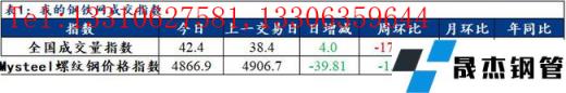 訊:全國建筑厚壁無縫鋼管成交量監測,成交量相對指數來看,全國42.4增4,北方15.9增3.7,華東68.5增11.6,南方30.9減3.6。今日螺紋鋼價格指數4866.9,較上一交易日減39.81。