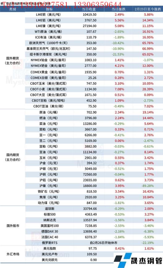 免責聲明:本網站(山東聊城晟杰無縫鋼管廠www.yztongfa.com)刊載的“受近期局勢影響大宗商品價格一覽表(3月3日)”等均源于網絡,版權歸原作者所有,且僅代表原作者觀點,本文所載信息僅供參考。轉載僅為學習與交流之目的,如無意中侵犯您的合法權益,請及時聯系刪除。本網站刊登此篇文章并不意味著本站贊同其觀點或證實其內容的真實性,我們不對其科學性、嚴肅性等作任何形式的保證。如果侵犯了您的版權,請盡快聯系我們予以撤銷,謝謝合作!