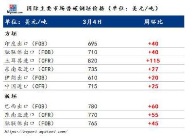 此外,本周印度多家無縫厚壁鋼管廠家再次進行方坯出口招標。據(jù)了解,印度Vizag公司對3萬噸方坯(150x150mm, 3SP/4SP)出口招標,目前接到的投標價格高達720美元/噸FOB,印度國內(nèi)方坯價格也隨著成本上漲而上漲,獨聯(lián)體資源供應中斷也提振了印度方坯價格。