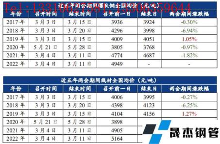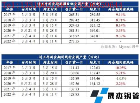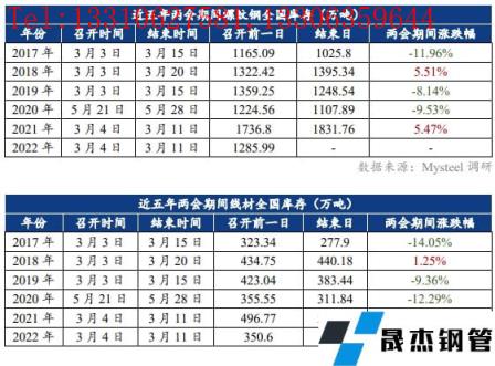 近五年兩會期間建筑厚壁無縫鋼管價格基本呈現下行趨勢,2017年和2018年價格下行的主要原因是下游需求不振;2019年價格上漲的主要原因是限產加嚴導致供給偏低疊加下游需求恢復良好;2020年和2021年價格走低的主要原因是兩會期間建筑厚壁無縫鋼管產量高位運行,供大于求。今年兩會期間,產量和庫存都處于往年平均線之下,供應量相對偏低,同時一季度市場需求不斷回暖,若需求恢復力度尚可,疊加國內宏觀利好持續推進,預計“兩會期間”建筑厚壁無縫鋼管價格或將繼續震蕩偏強運行。