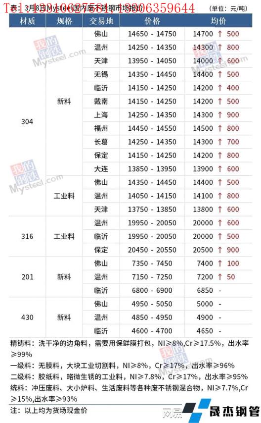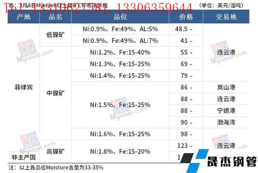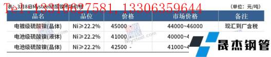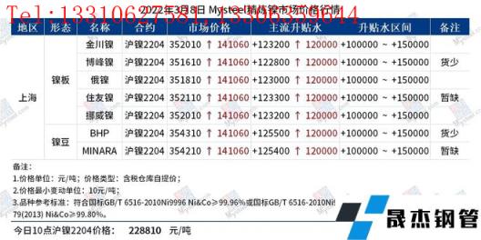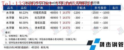 免責聲明:本網站(山東聊城晟杰無縫鋼管廠www.yztongfa.com)刊載的“鎳產業鏈價格(2022.3.8)”等均源于網絡,版權歸原作者所有,且僅代表原作者觀點,本文所載信息僅供參考。轉載僅為學習與交流之目的,如無意中侵犯您的合法權益,請及時聯系刪除。本網站刊登此篇文章并不意味著本站贊同其觀點或證實其內容的真實性,我們不對其科學性、嚴肅性等作任何形式的保證。如果侵犯了您的版權,請盡快聯系我們予以撤銷,謝謝合作!