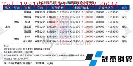 免責聲明:本網站(山東聊城晟杰無縫鋼管廠www.yztongfa.com)刊載的“鎳價極端行情之下 下游壓力凸顯”等均源于網絡,版權歸原作者所有,且僅代表原作者觀點,本文所載信息僅供參考。轉載僅為學習與交流之目的,如無意中侵犯您的合法權益,請及時聯系刪除。本網站刊登此篇文章并不意味著本站贊同其觀點或證實其內容的真實性,我們不對其科學性、嚴肅性等作任何形式的保證。如果侵犯了您的版權,請盡快聯系我們予以撤銷,謝謝合作!