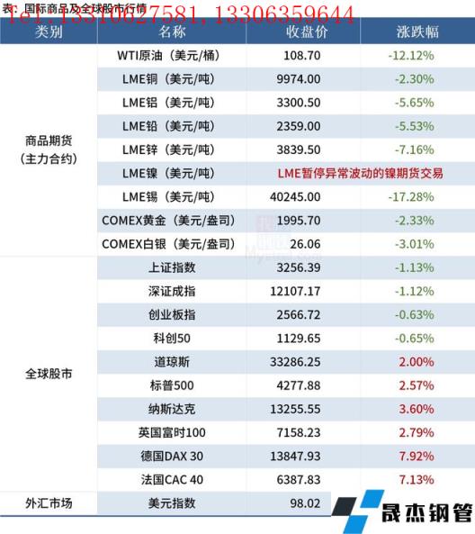 免責聲明:本網站(山東聊城晟杰無縫鋼管廠www.yztongfa.com)刊載的“2022年03月10日早讀:黑色系夜盤全線下挫,國際油價大跌超12%”等均源于網絡,版權歸原作者所有,且僅代表原作者觀點,本文所載信息僅供參考。轉載僅為學習與交流之目的,如無意中侵犯您的合法權益,請及時聯系刪除。本網站刊登此篇文章并不意味著本站贊同其觀點或證實其內容的真實性,我們不對其科學性、嚴肅性等作任何形式的保證。如果侵犯了您的版權,請盡快聯系我們予以撤銷,謝謝合作!