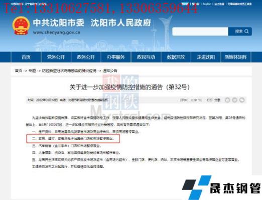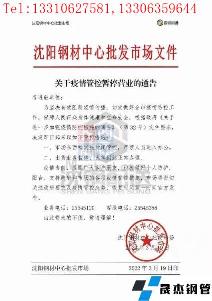 免責聲明:本網站(山東聊城晟杰無縫鋼管廠www.yztongfa.com)刊載的“快訊:沈陽加強疫情管控 所有鋼材_無縫鋼管市場或停止辦公及出庫”等均源于網絡,版權歸原作者所有,且僅代表原作者觀點,本文所載信息僅供參考。轉載僅為學習與交流之目的,如無意中侵犯您的合法權益,請及時聯系刪除。本網站刊登此篇文章并不意味著本站贊同其觀點或證實其內容的真實性,我們不對其科學性、嚴肅性等作任何形式的保證。如果侵犯了您的版權,請盡快聯系我們予以撤銷,謝謝合作!
