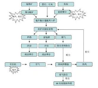 富錳渣生產(chǎn)線整個(gè)工藝系統(tǒng)由原材料入廠、儲(chǔ)存、電子稱稱量、皮帶輸送機(jī)上料、布料小車布料、高爐還原冶煉、鐵水包,成品入庫(kù)及成品發(fā)放等組成。在生產(chǎn)過(guò)程中排出大量的高溫含塵煙氣,煙氣主要成份是煤氣,所產(chǎn)生的煙塵是要是爐塵和瓦斯泥。