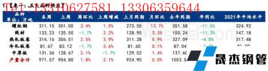 供應(yīng)方面,本周五大厚壁無縫鋼管品種供應(yīng)增至971.57萬噸,增量16.77萬噸,增幅1.8%,其中建材環(huán)比增量7.9萬噸,增幅1.8%,板材環(huán)比增量8.89萬噸,增幅1.7%。