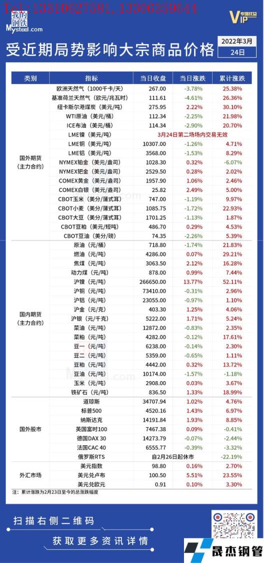 免責聲明:本網站(山東聊城晟杰無縫鋼管廠www.yztongfa.com)刊載的“受近期局勢影響大宗商品價格一覽表(3月24日)”等均源于網絡,版權歸原作者所有,且僅代表原作者觀點,本文所載信息僅供參考。轉載僅為學習與交流之目的,如無意中侵犯您的合法權益,請及時聯系刪除。本網站刊登此篇文章并不意味著本站贊同其觀點或證實其內容的真實性,我們不對其科學性、嚴肅性等作任何形式的保證。如果侵犯了您的版權,請盡快聯系我們予以撤銷,謝謝合作!