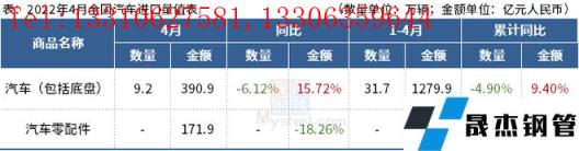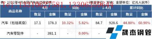 免責聲明:本網站(山東聊城晟杰無縫鋼管廠www.yztongfa.com)刊載的“海關總署:4月中國出口汽車17.1萬輛,同比增長10.32%”等均源于網絡,版權歸原作者所有,且僅代表原作者觀點,本文所載信息僅供參考。轉載僅為學習與交流之目的,如無意中侵犯您的合法權益,請及時聯系刪除。本網站刊登此篇文章并不意味著本站贊同其觀點或證實其內容的真實性,我們不對其科學性、嚴肅性等作任何形式的保證。如果侵犯了您的版權,請盡快聯系我們予以撤銷,謝謝合作!