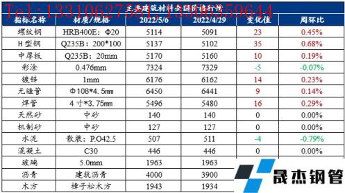 免責聲明:本網站(山東聊城晟杰無縫鋼管廠www.yztongfa.com)刊載的“建筑原材料周報(4.29-5.6)”等均源于網絡,版權歸原作者所有,且僅代表原作者觀點,本文所載信息僅供參考。轉載僅為學習與交流之目的,如無意中侵犯您的合法權益,請及時聯系刪除。本網站刊登此篇文章并不意味著本站贊同其觀點或證實其內容的真實性,我們不對其科學性、嚴肅性等作任何形式的保證。如果侵犯了您的版權,請盡快聯系我們予以撤銷,謝謝合作!