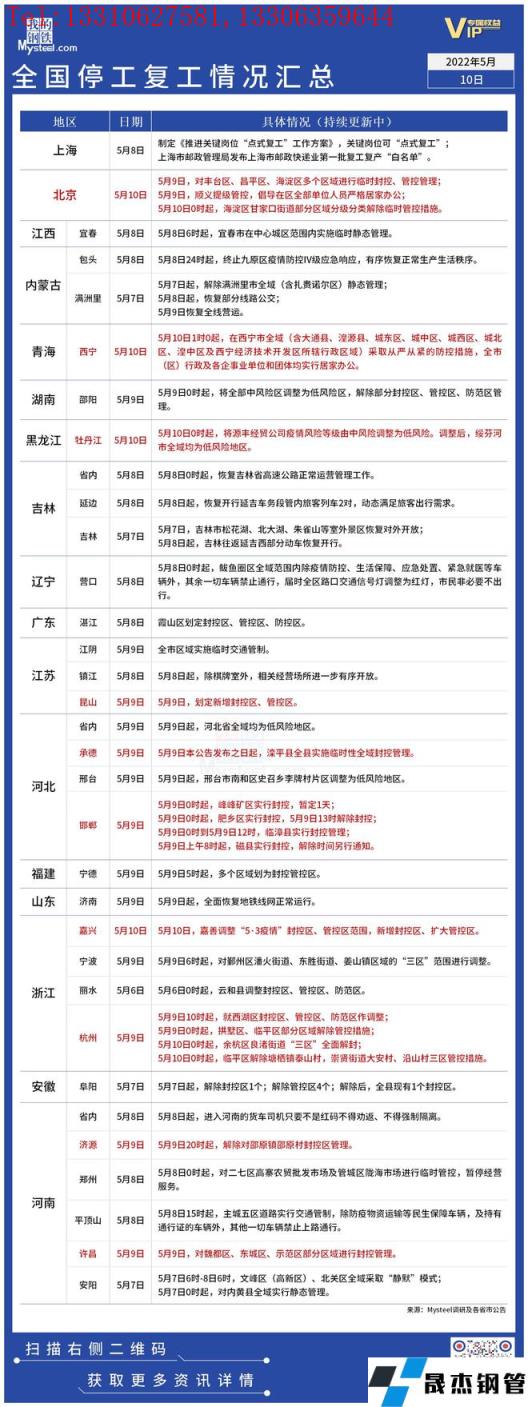 截至5月10日,據(jù)不完全統(tǒng)計(jì),共有17個(gè)省份發(fā)布了停工復(fù)工最新信息。5月9日,北京豐臺(tái)區(qū)、昌平區(qū)、海淀區(qū)多個(gè)區(qū)域進(jìn)行臨時(shí)封控、管控管理。邯鄲多區(qū)域?qū)嵭蟹饪毓芾怼?月10日1時(shí)起,西寧市全域采取從嚴(yán)從緊的防控措施,全市(區(qū))行政及各企事業(yè)單位和團(tuán)體均實(shí)行居家辦公。具體情況如下: