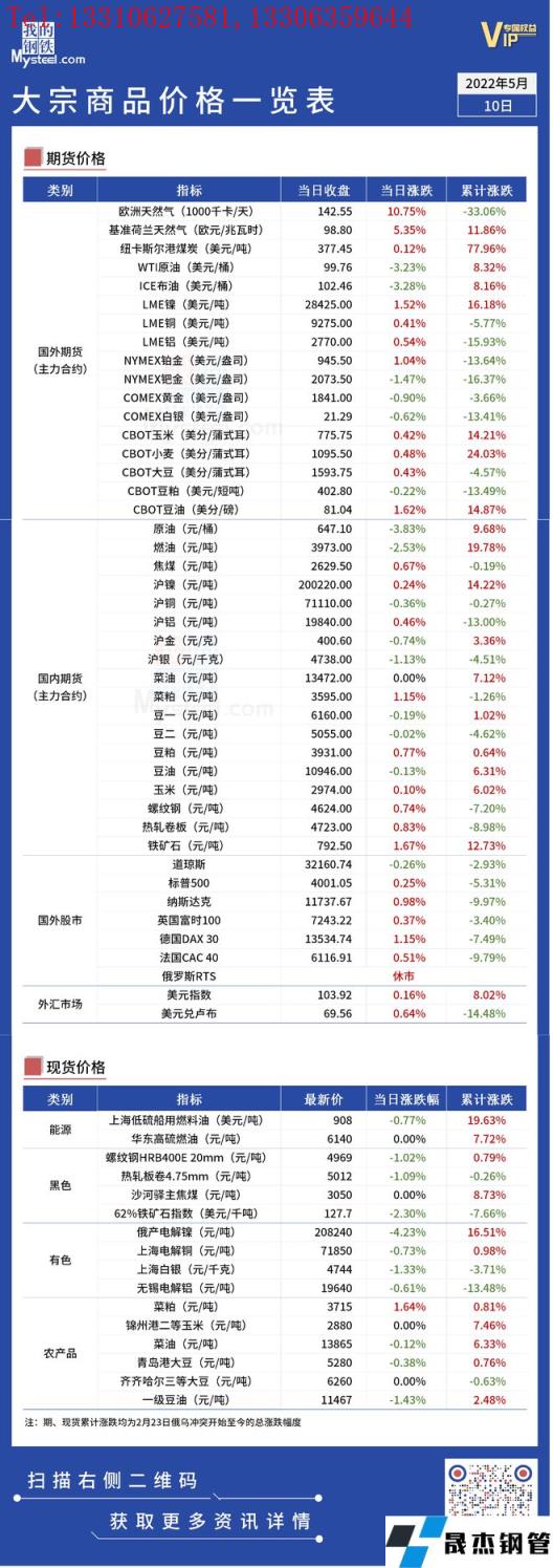 免責聲明:本網站(山東聊城晟杰無縫鋼管廠www.yztongfa.com)刊載的“俄烏局勢丨大宗商品價格一覽表(5月10日)”等均源于網絡,版權歸原作者所有,且僅代表原作者觀點,本文所載信息僅供參考。轉載僅為學習與交流之目的,如無意中侵犯您的合法權益,請及時聯系刪除。本網站刊登此篇文章并不意味著本站贊同其觀點或證實其內容的真實性,我們不對其科學性、嚴肅性等作任何形式的保證。如果侵犯了您的版權,請盡快聯系我們予以撤銷,謝謝合作!