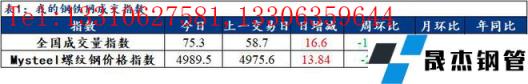 訊:全國建筑厚壁無縫鋼管成交量監(jiān)測,成交量相對指數(shù)來看,全國75.3增16.6,北方69.7增23.4,華東98增18.6,南方55.7增11。今日螺紋鋼價格指數(shù)4989.5,較上一交易日增13.84。