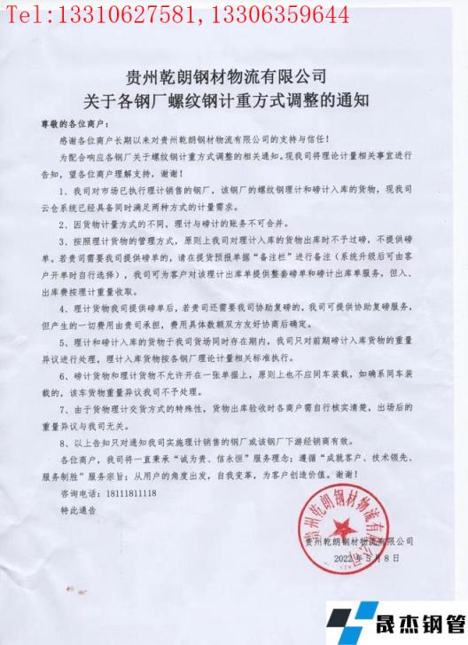 免責(zé)聲明:本網(wǎng)站(山東聊城晟杰無(wú)縫鋼管廠www.yztongfa.com)刊載的“貴州乾朗鋼材_無(wú)縫鋼管物流有限公司關(guān)于各無(wú)縫鋼管廠家螺紋鋼計(jì)重方式調(diào)整的通知”等均源于網(wǎng)絡(luò),版權(quán)歸原作者所有,且僅代表原作者觀點(diǎn),本文所載信息僅供參考。轉(zhuǎn)載僅為學(xué)習(xí)與交流之目的,如無(wú)意中侵犯您的合法權(quán)益,請(qǐng)及時(shí)聯(lián)系刪除。本網(wǎng)站刊登此篇文章并不意味著本站贊同其觀點(diǎn)或證實(shí)其內(nèi)容的真實(shí)性,我們不對(duì)其科學(xué)性、嚴(yán)肅性等作任何形式的保證。如果侵犯了您的版權(quán),請(qǐng)盡快聯(lián)系我們予以撤銷(xiāo),謝謝合作!