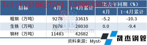 1-4月,中國粗鋼產量33615萬噸,同比下降10.3%;生鐵產量28030萬噸,同比下降9.4%;厚壁無縫鋼管產量42682萬噸,同比下降5.9%。