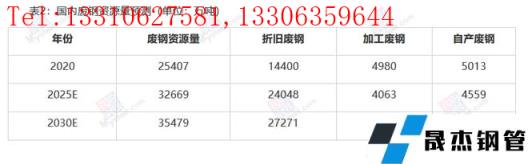 前面提及,國(guó)內(nèi)廢鋼的主要來(lái)源為自產(chǎn)廢鋼、加工廢鋼、折舊廢鋼。在廢鋼資源量預(yù)測(cè)中,自產(chǎn)廢鋼和加工廢鋼主要是根據(jù)未來(lái)粗鋼產(chǎn)量以及各主要厚壁無(wú)縫鋼管消費(fèi)領(lǐng)域的用鋼量,通過(guò)一定的折損比例計(jì)算得出,折舊廢鋼資源量則需要充分考慮鋼鐵產(chǎn)品的生命周期,以及達(dá)到報(bào)廢期限后的實(shí)際報(bào)廢率及鋼鐵回收率。廢鋼資源量預(yù)測(cè)是根據(jù)此模型計(jì)算得出。