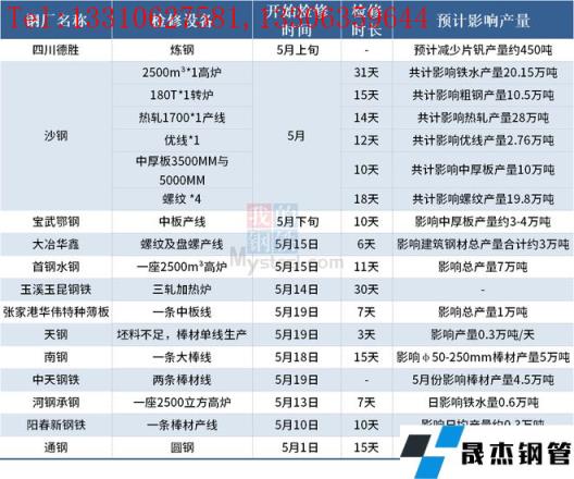 據(jù)不完全統(tǒng)計(jì),截至5月20日,國內(nèi)13家無縫厚壁鋼管廠家發(fā)布檢修計(jì)劃。其中,中天鋼鐵因一座轉(zhuǎn)爐檢修,坯料不足,兩條棒材線停產(chǎn)檢修,預(yù)計(jì)5月份影響棒材產(chǎn)量4.5萬噸。