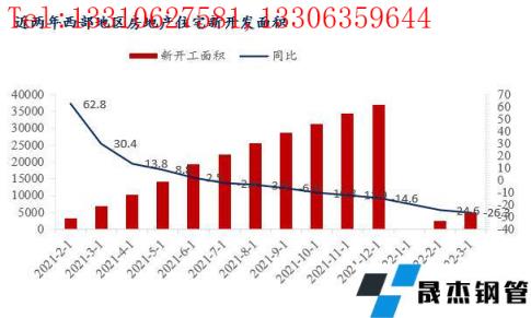 2022年以來,從上圖可以看出來,受住房不炒政策受影響,西北區(qū)域各省市房地產(chǎn)開發(fā)進(jìn)度緩慢,房地產(chǎn)開發(fā)企業(yè)投資完成額以及新開工面積同比均是小幅下降。分省市來看,陜西作為西北經(jīng)濟(jì)龍頭老大,房地產(chǎn)開發(fā)投資表現(xiàn)較好。2022年一季度,陜西省房地產(chǎn)開發(fā)企業(yè)完成投資674.03億元,同比增長5%,比1-2月提高1.8個百分點。而甘肅區(qū)域,一季度GDP同比增長5.3%,固定資產(chǎn)投資同比增長12.9%。其中,項目投資增長13.4%,房地產(chǎn)開發(fā)投資增長11.7%,商品房銷售面積下降10.7%。另外如分別是寧夏區(qū)域房地產(chǎn)開發(fā)投資增長增速為-1%。這在去年寧夏區(qū)域房地產(chǎn)開發(fā)投資增速為正數(shù),今年面臨較大下行壓力。整體來說,由于受疫情以及資金問題,工程項目進(jìn)度不如預(yù)期,厚壁無縫鋼管需求量同比減少,這也是前期西北區(qū)域建筑厚壁無縫鋼管消化緩慢以及庫存積壓原因。
