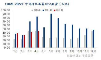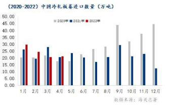 海關總署數(shù)據(jù)顯示:2022年1-4月份我國冷軋板(帶)出口總量共計159.53萬噸,年同比下降40.79%。2022年1-4月份我國冷軋板(帶)進口總量共計96.25萬噸,年同比上升1.90%。